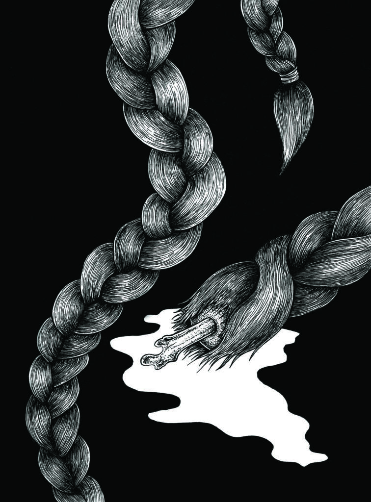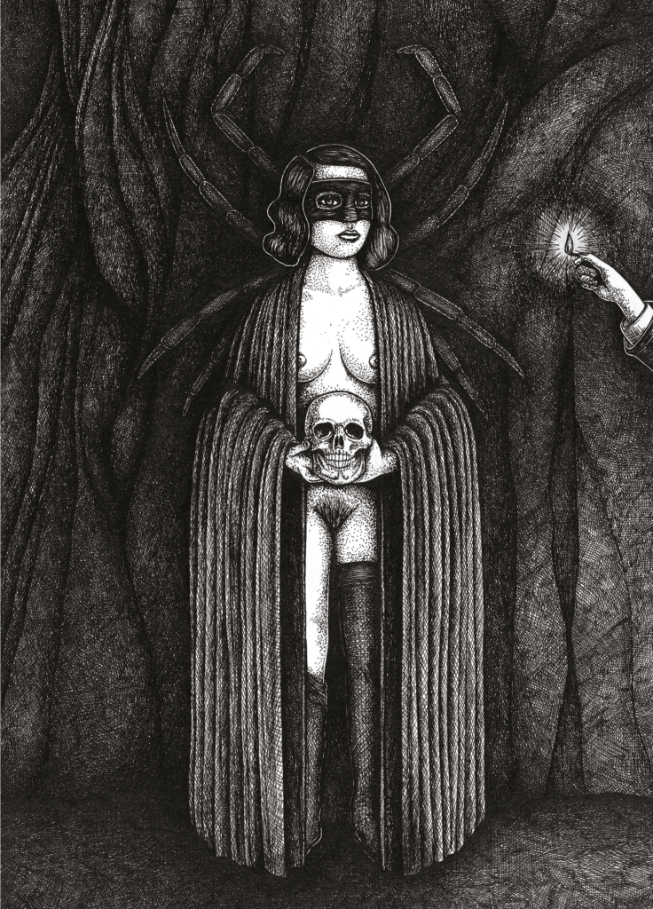 Une empreinte qui se traduit par un intense noir et blanc, façonné à base d’encre de chine, de pointillisme et de traits entrecroisés qui donnent au noir différentes tonalités et une impression de strates successives. Peut-être à l’image de l’évolution de la petite fille timide qu’elle était, très tôt sensible à l’humour noir et aux sous-entendus, capable aussi de se rouler par terre de rage. « Il y a une colère qui est en moi depuis longtemps, liée à la difficulté de prendre ma place en tant que femme et artiste. Mais avec le temps, je me suis approprié ma féminité, ma sexualité ».